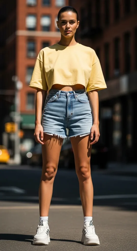A boxy cropped top with denim shorts gives a modern, confident silhouette. It’s relaxed but intentional, perfect for warmer days when you want airflow and style combined.