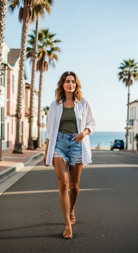 An oversized cotton shirt layered over denim shorts creates an effortless, borrowed-from-the-closet vibe. It’s casual, breathable, and perfect for transitioning from indoors to outdoor summer heat.