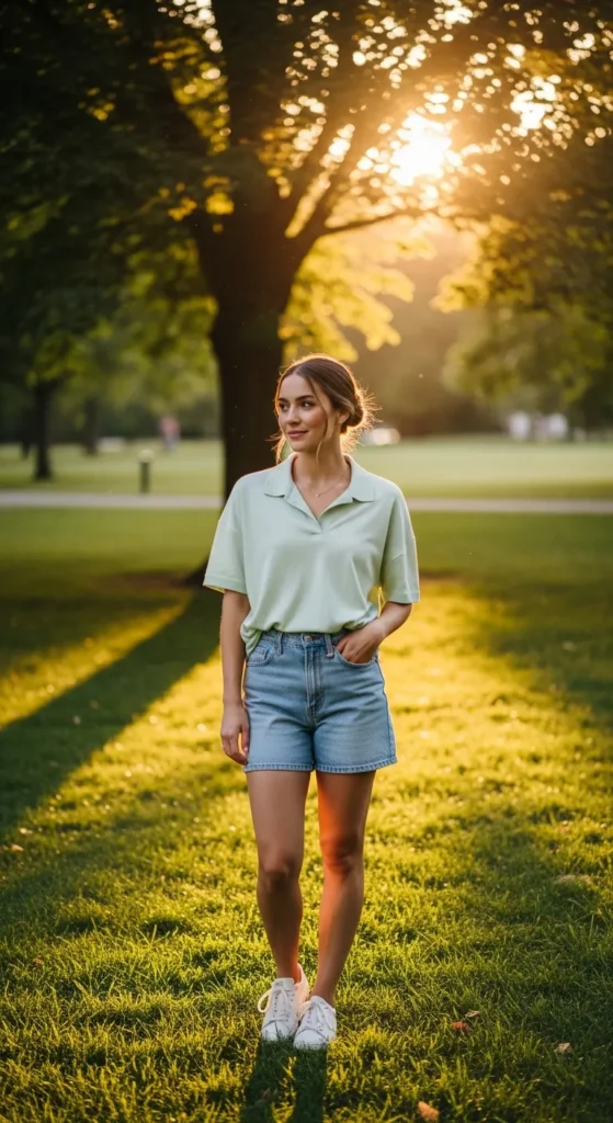 A relaxed-fit polo with denim shorts offers a fresh alternative to tees. It feels slightly structured but still casual, perfect for effortless summer confidence.
