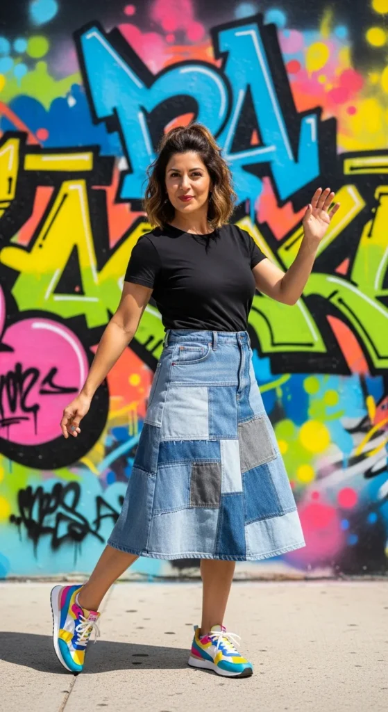 Stylist Suggestion: Add colorful sneakers to echo the patchwork tones. This ties the outfit together in a playful way.
