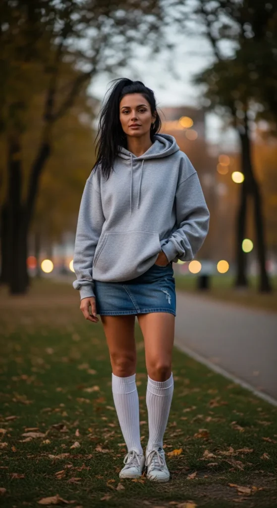 Stylist Suggestion: Pair with high socks and sneakers. This adds a sporty touch that complements the relaxed hoodie vibe.