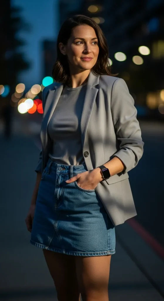 A lightweight blazer layered over a simple top and denim skirt adds instant polish. It’s perfect for transitioning from day to evening.