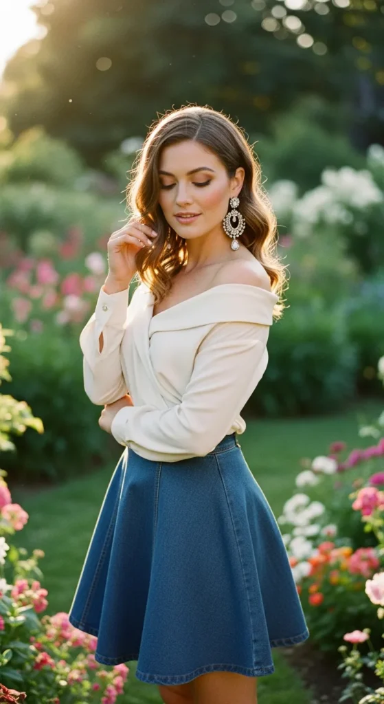 An off-shoulder top styled with an A-line denim skirt highlights the neckline beautifully while maintaining a flattering silhouette. It feels soft, feminine, and perfect for warm evenings.