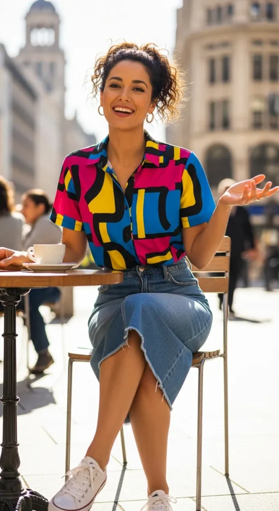 A bold printed shirt tucked into a straight-cut denim skirt creates a striking yet wearable combination. It’s expressive while still grounded.