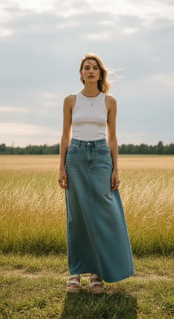 A simple ribbed tank tucked into a flowing maxi denim skirt creates an elongated, relaxed silhouette. It feels calm, comfortable, and quietly stylish.
