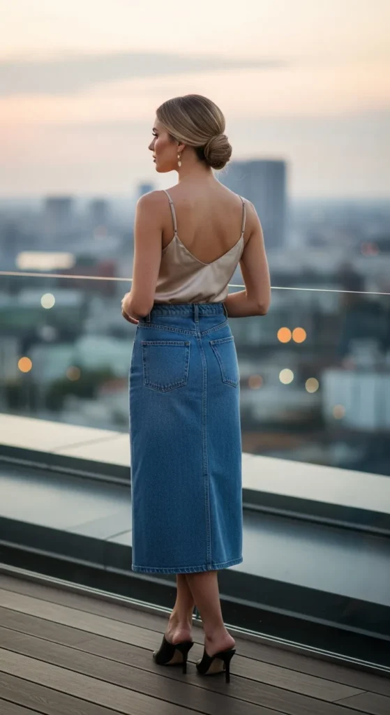 A silky satin camisole paired with a structured midi denim skirt blends softness with structure. This outfit feels feminine yet grounded, ideal for evening dinners or rooftop gatherings.