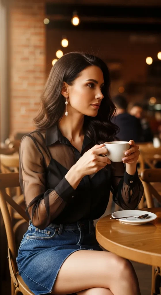 A delicate sheer blouse paired with a structured denim skirt creates an elegant contrast. It feels romantic yet grounded, ideal for special daytime occasions.