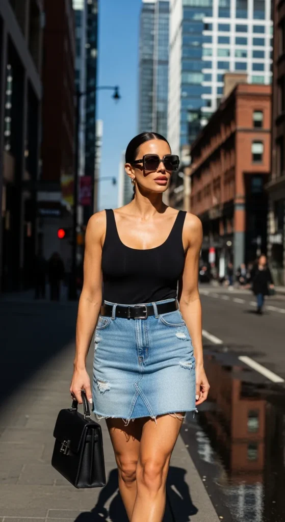 A fitted knit tank tucked into a distressed denim skirt creates a slightly edgy, laid-back feel. It’s effortless but carries just enough attitude for everyday wear.