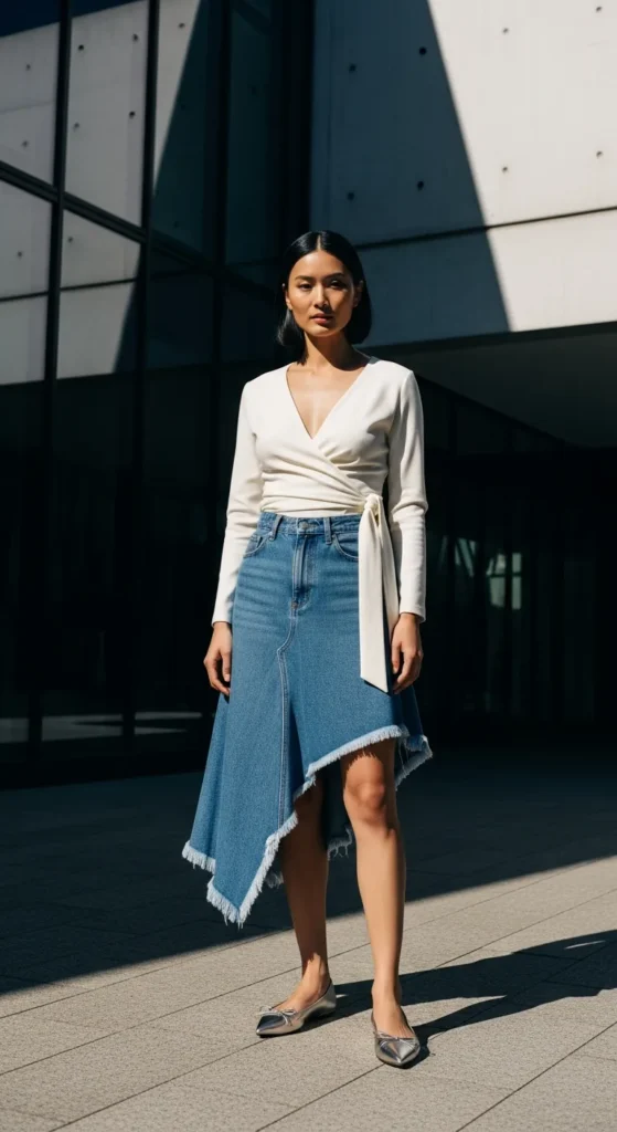 A wrap top styled with an asymmetrical denim skirt creates movement and interest. The lines feel dynamic, making the outfit visually engaging without being overwhelming.