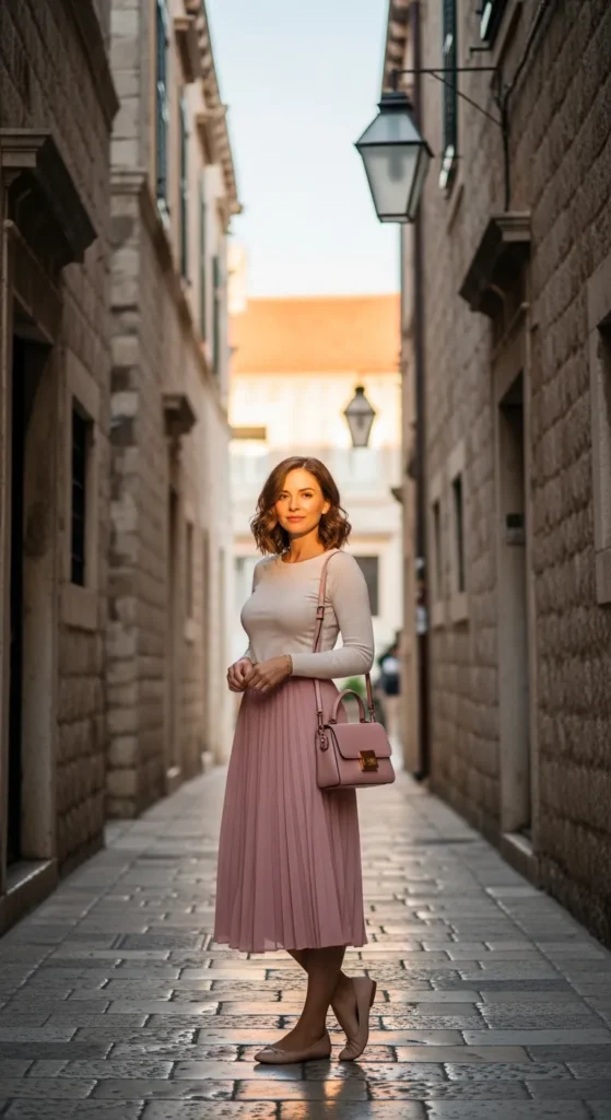 A blush pleated midi skirt paired with a fitted cream top feels polished yet romantic. The soft pleats move gracefully while you wander through hidden alleyways.