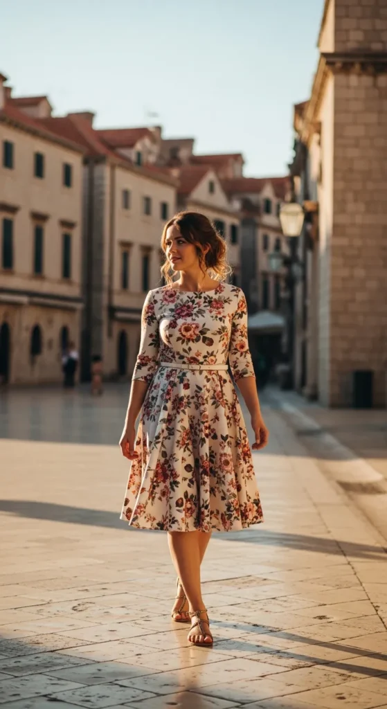 A delicate floral tea-length dress in soft pinks and greens feels like it belongs in a European summer romance. The structured waist keeps the silhouette flattering and feminine.