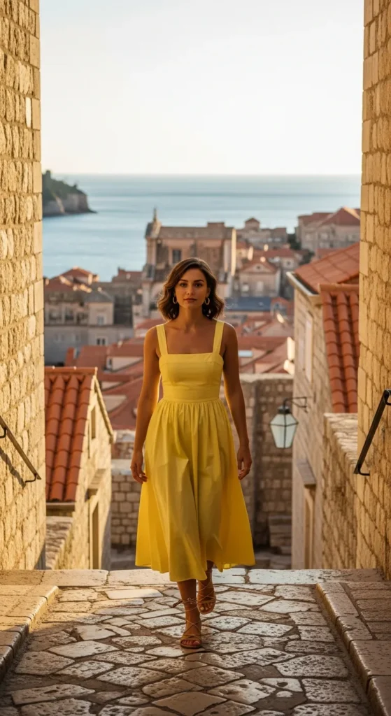 A soft lemon midi dress in breathable cotton with delicate straps feels perfectly romantic against Dubrovnik’s honey-toned stone walls. The gentle movement of the skirt catches the sea breeze, creating effortless elegance during golden hour strolls.