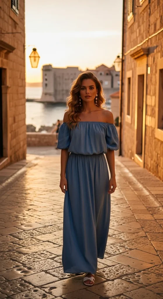 A powder blue off-shoulder maxi dress captures the Adriatic sky perfectly. The flowy fabric glides along cobblestone streets, creating a romantic silhouette against historic stone façades.