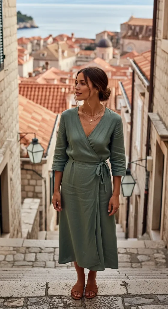 A sage green linen wrap dress feels calm and romantic, blending beautifully with the coastal scenery. The wrap silhouette flatters naturally while allowing movement during long Old Town walks.