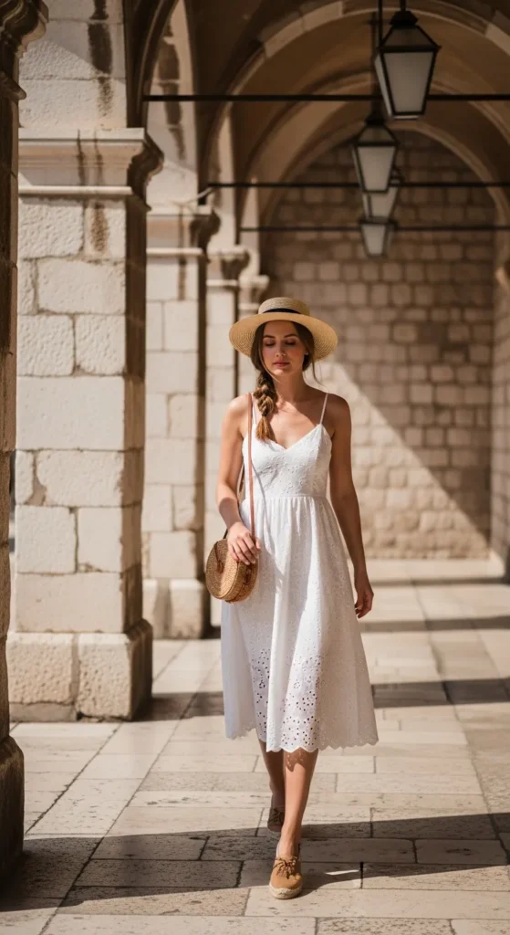 A white eyelet sundress feels timeless and airy, perfect for mid-morning coffee runs near the city walls. The intricate fabric adds texture while staying light enough for the Croatian summer heat.