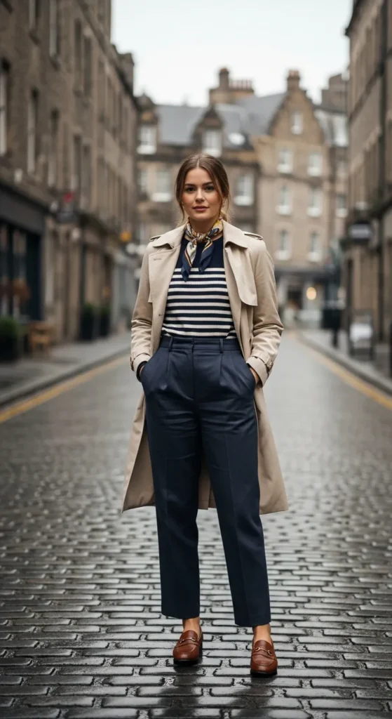 A timeless trench coat over straight-leg tailored trousers and a striped knit feels sophisticated and city-smart. It’s ideal for breezy afternoons when the wind moves dramatically through Old Town streets.