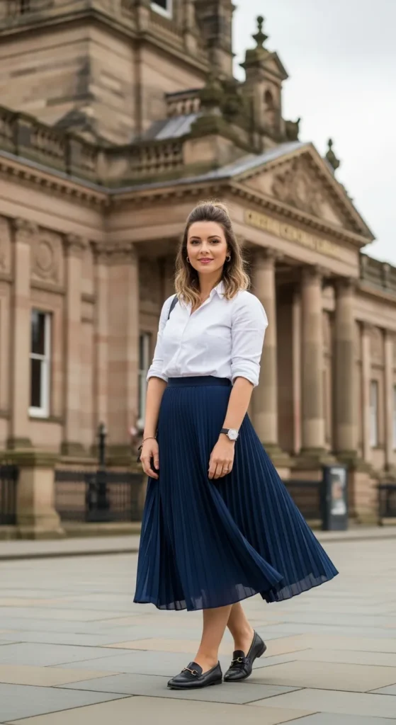 A crisp white shirt tucked into a flowing pleated skirt feels intellectual and graceful, perfect for museum visits and quiet bookstores.