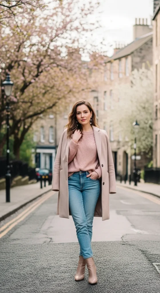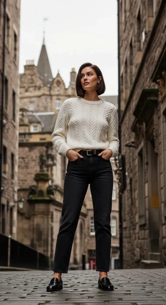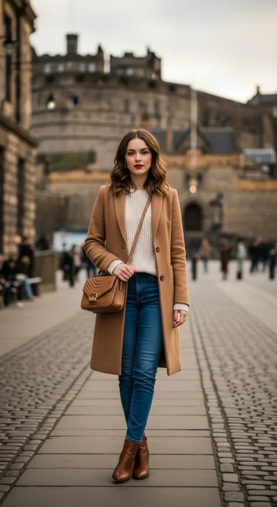 A tailored camel coat layered over a soft cream knit and slim blue denim feels effortlessly refined against Edinburgh’s stone backdrops. It’s polished but relaxed, perfect for slow strolls along the Royal Mile and cozy café stops.