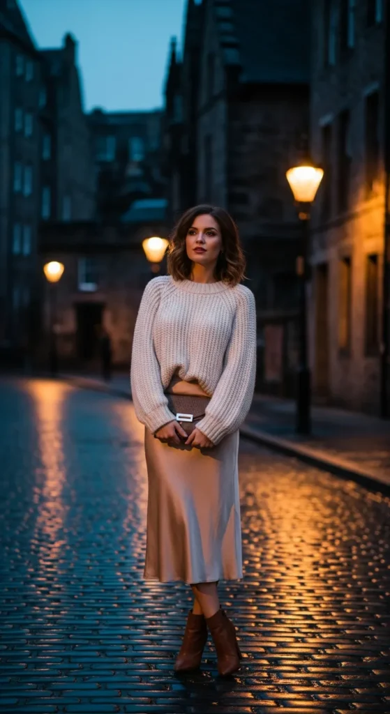 A cozy knit tucked into a flowing satin midi skirt creates a beautiful texture contrast. It’s soft, feminine, and ideal for transitioning from daytime exploring to evening cocktails.