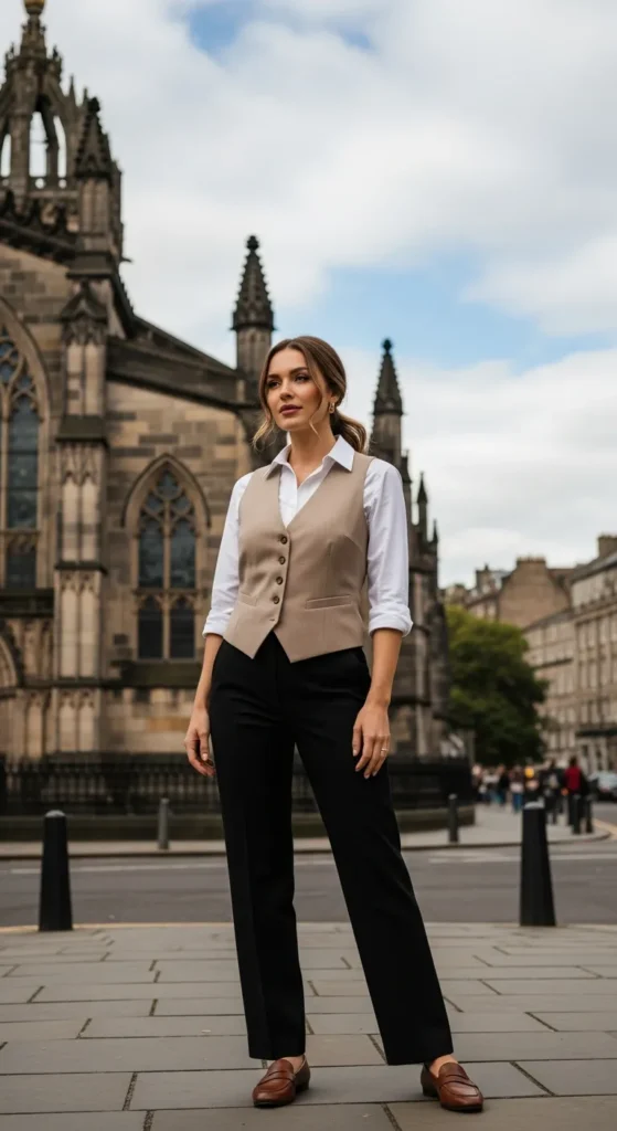 A tailored vest layered over a crisp button-down gives subtle academic charm without feeling overly formal. It’s perfect for exploring museums and historic sites.