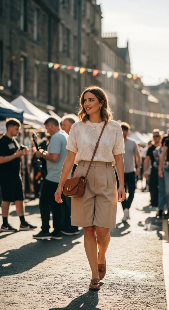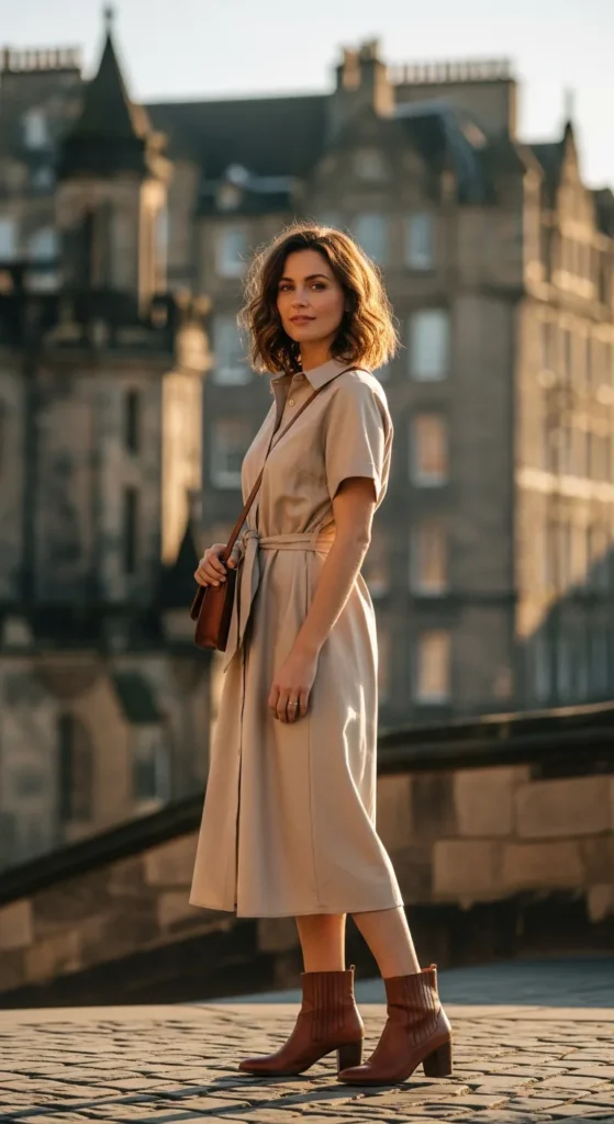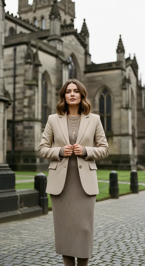 Layering a structured neutral blazer over a soft knit midi dress blends modern confidence with historic romance. It feels put-together yet comfortable enough for museum visits and evening dinners in New Town.