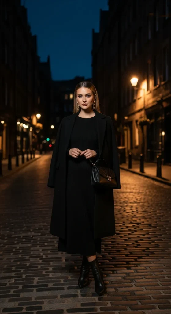 A simple black midi dress layered under a classic coat feels elegant for evening dinners with castle views. It’s understated but powerful.