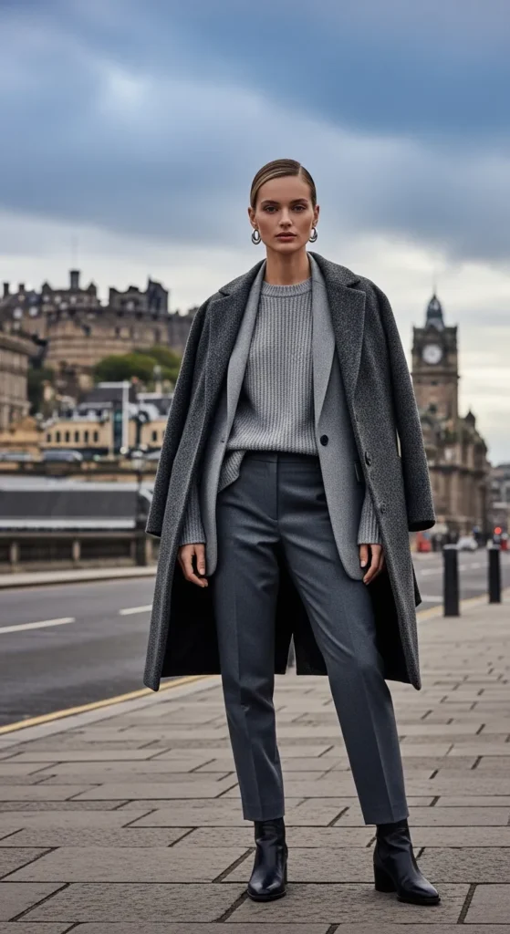 Layering different shades of grey, charcoal coat, dove knit, slate trousers, mirrors Edinburgh’s architecture in the most elegant way. It feels intentional, refined, and deeply connected to the city’s mood.