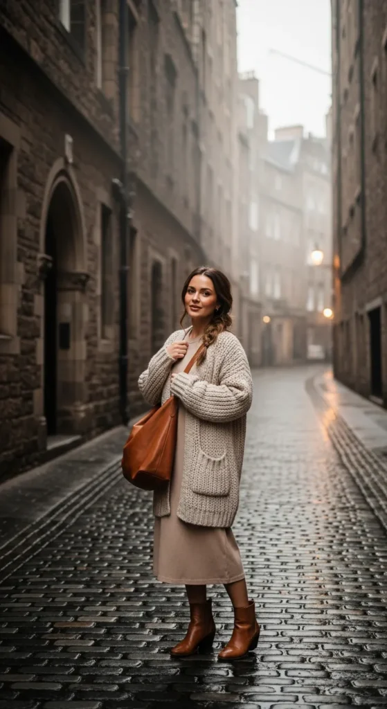 A textured cardigan layered over a simple midi dress feels warm and inviting for misty mornings in Edinburgh. It’s easy, photogenic, and effortlessly charming.