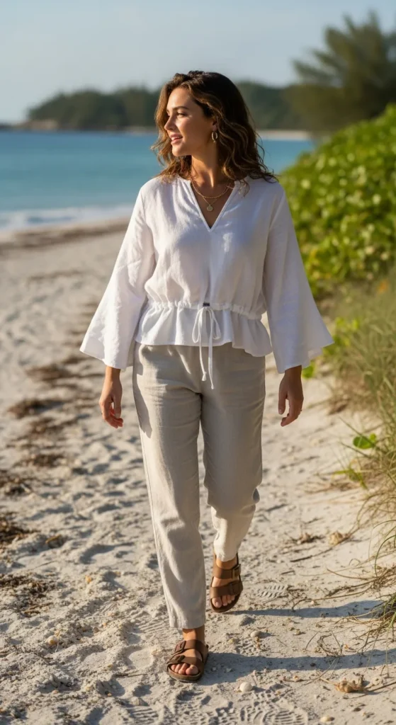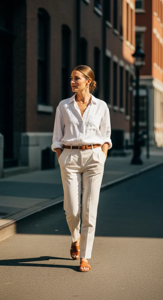 An airy linen button-down paired with softly tailored cream trousers creates an outfit that feels calm, composed, and breathable, ideal for slow summer mornings and polished afternoons without ever looking overdone.