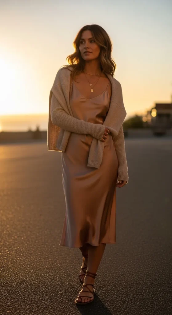 A draped cardigan softens a sleek slip dress, creating a look that feels intimate, relaxed, and quietly luxurious for summer evenings.