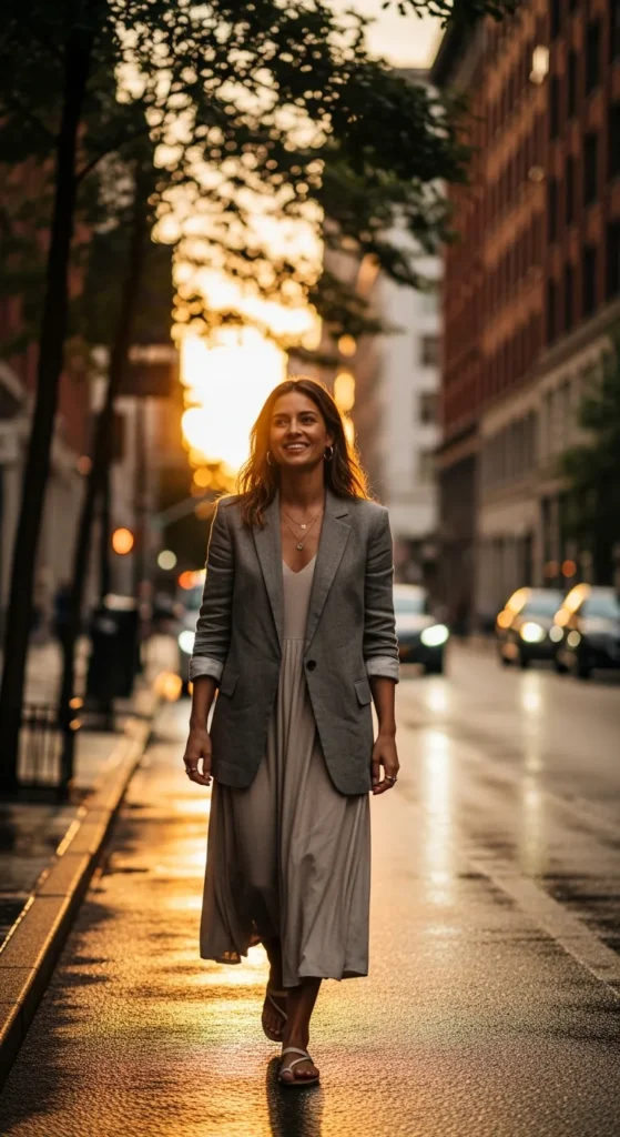 A lightweight blazer instantly elevates a simple dress, creating a balance between structure and softness that works beautifully for cooler summer evenings.