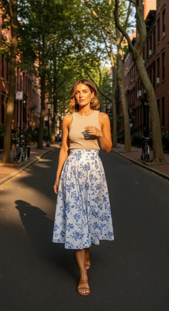 Stylist Suggestion: Opt for delicate ankle-strap sandals to complement the skirt’s flow. Keeping makeup soft maintains the quiet elegance of the look.