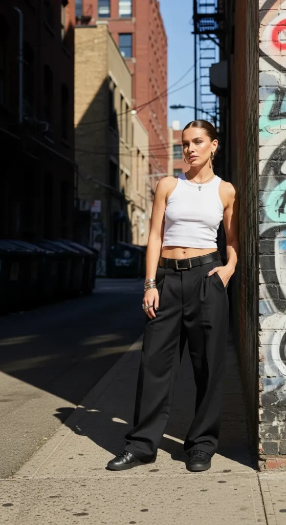 Stylist Suggestion: Add chunky silver rings and a sleek belt. These structured details sharpen the relaxed pants silhouette and make the outfit feel intentionally edgy.