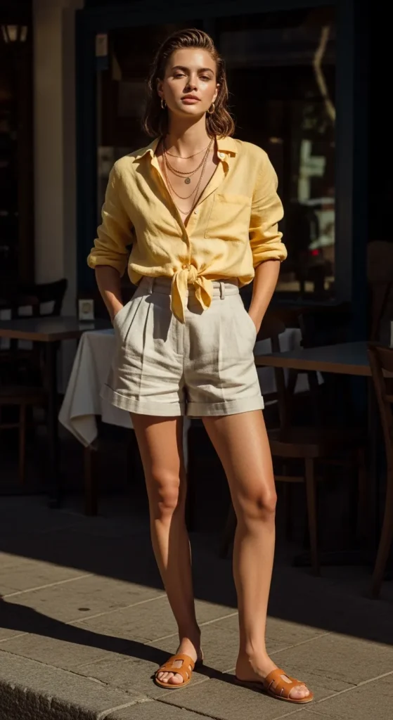 Soft butter yellow is quietly becoming the color of summer 2026. A relaxed linen button-up paired with matching high-waisted linen shorts feels airy, polished, and effortlessly feminine for warm sunny days.