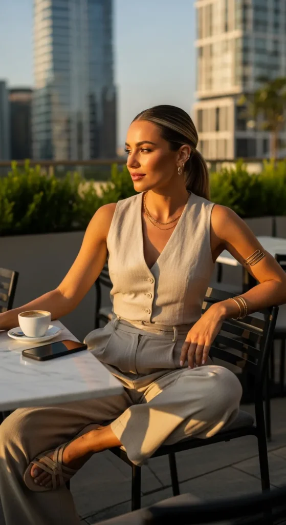 Tailored linen vests are trending strongly in 2026. Wearing a sleeveless linen vest with wide leg trousers creates a chic tailored summer outfit perfect for brunch or city walks.
