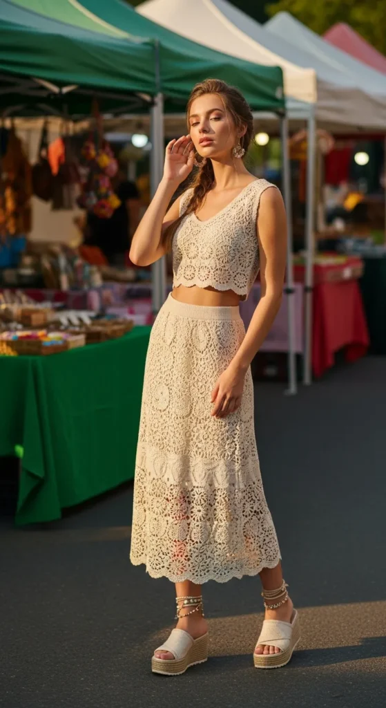 Crochet is returning in a fresh modern way for summer 2026. A crochet crop top paired with a matching midi skirt creates a playful textured outfit that feels handmade, nostalgic, and trendy.
