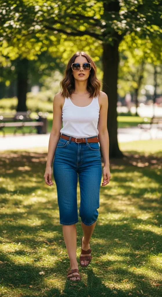 Capri pants are quietly making a comeback in summer fashion. A pair of slim black capri pants with a fitted off-shoulder top creates a sleek and feminine silhouette that feels both nostalgic and modern.