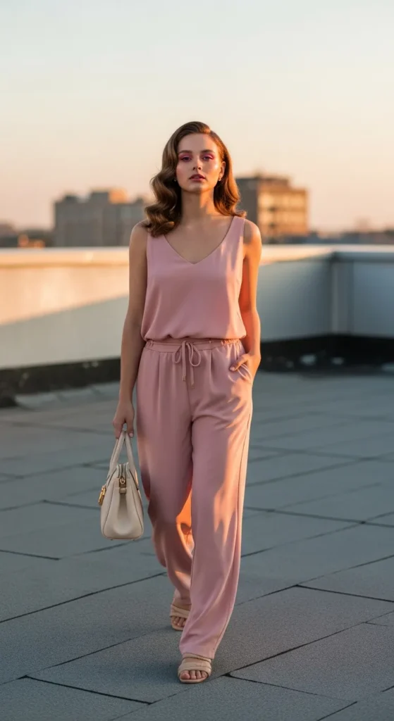Soft pink from head to toe is becoming one of the most loved color trends for summer 2026. A blush tank top with matching flowy trousers creates a feminine monochrome moment.