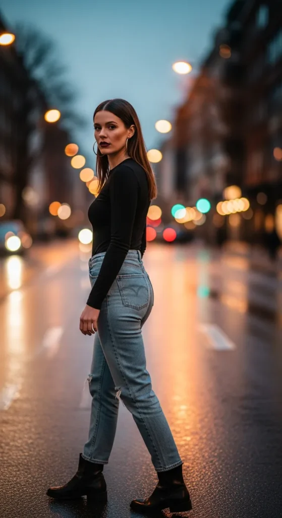 A fitted black top with light wash jeans creates a timeless, flattering contrast. It feels simple but powerful, perfect for casual dinners or evening walks.