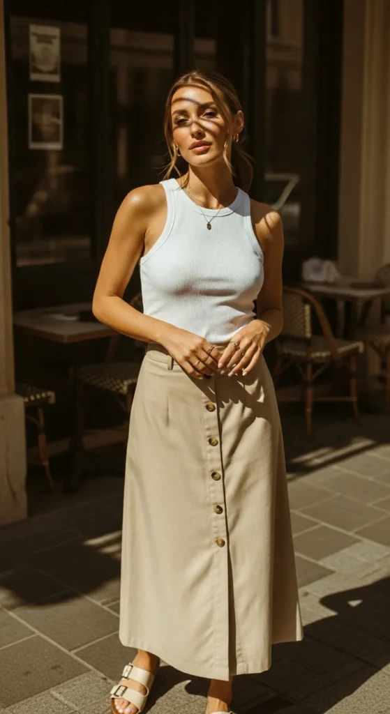 A button-front skirt paired with a fitted tank top gives a vintage-inspired casual charm. It feels light, feminine, and slightly nostalgic in the best way.