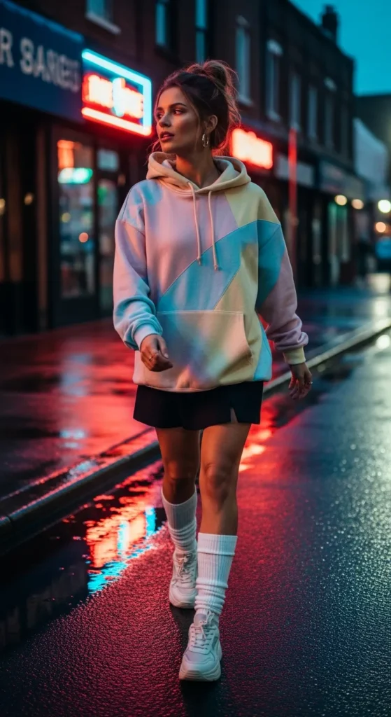A relaxed hoodie paired with a mini skirt creates a fun, unexpected contrast. It’s cozy on top, flirty on the bottom, perfect for playful, informal first dates.