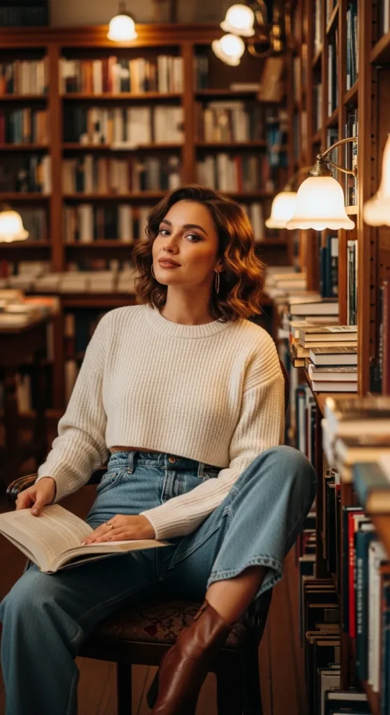 A cropped sweater paired with high-waist jeans creates a cozy yet structured silhouette. It feels warm, approachable, and perfect for coffee or bookstore dates.