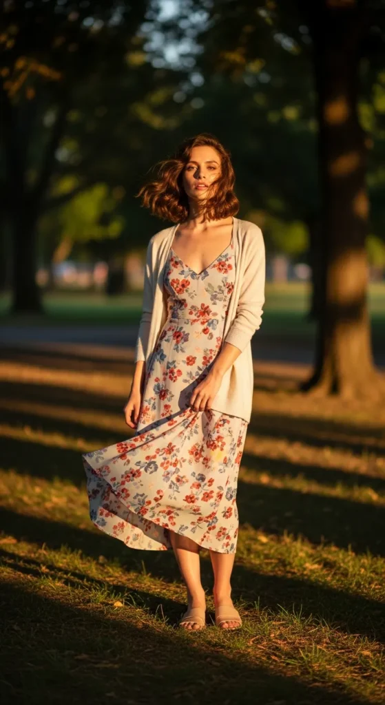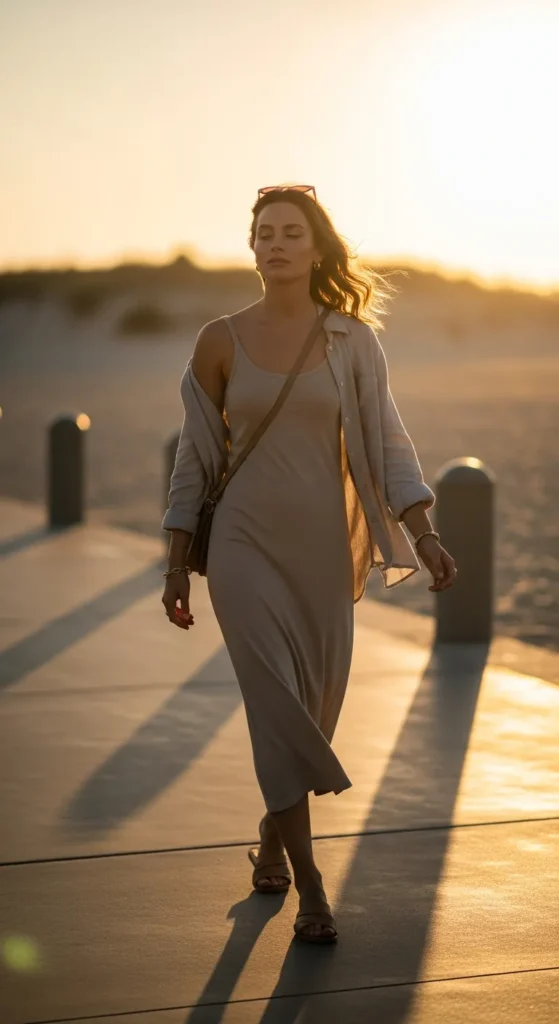 A flowy midi dress layered with a light cardigan feels romantic and approachable. The movement of the fabric adds softness, making it perfect for a sunset walk or casual outdoor dinner.