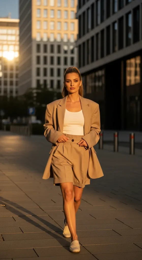 An oversized blazer styled with tailored shorts creates a confident, fashion-forward look. It feels bold but still wearable, perfect for city dates or modern café meetups.