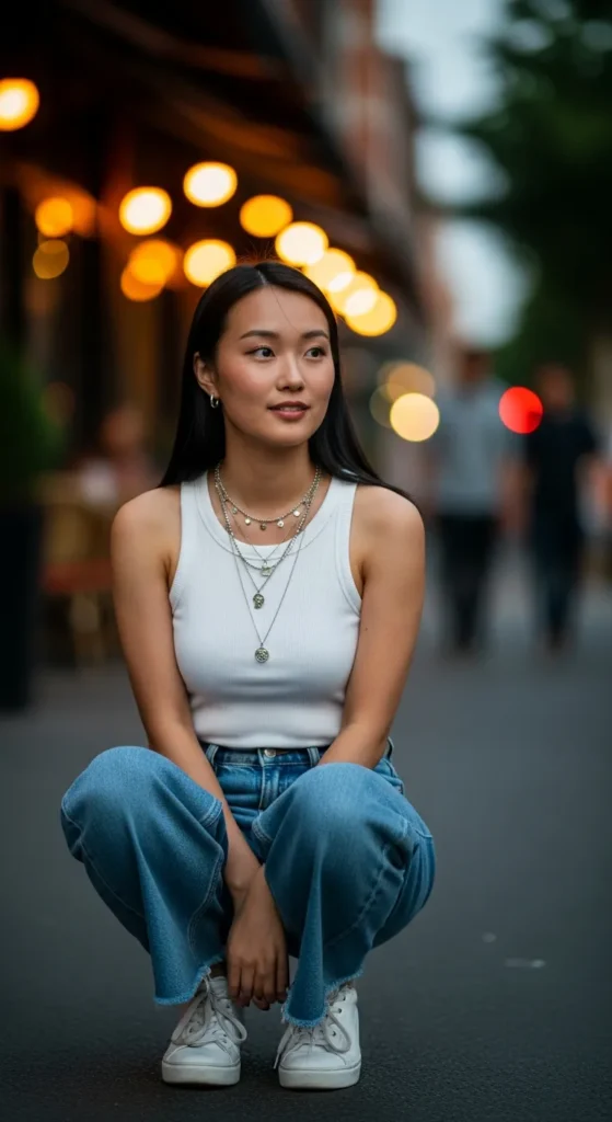 A ribbed fitted tank tucked into wide-leg jeans gives a modern, slightly edgy casual vibe. It’s relaxed but still structured enough to show intention, perfect for a laid-back evening coffee or arcade date.