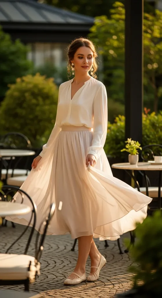A soft blouse tucked into a flowy midi skirt creates a romantic and graceful silhouette. It feels gentle and feminine, ideal for a more thoughtful, slow-paced date.