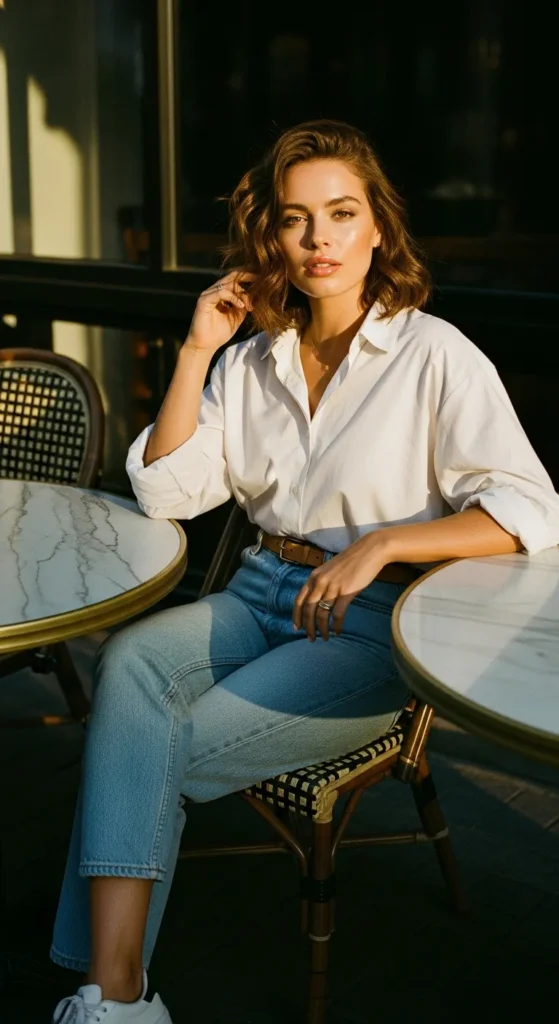 A crisp white button-down tucked loosely into straight-leg jeans creates that effortless “I just threw this on but still look amazing” vibe. It feels clean, modern, and relaxed, perfect for a casual coffee or daytime stroll date.