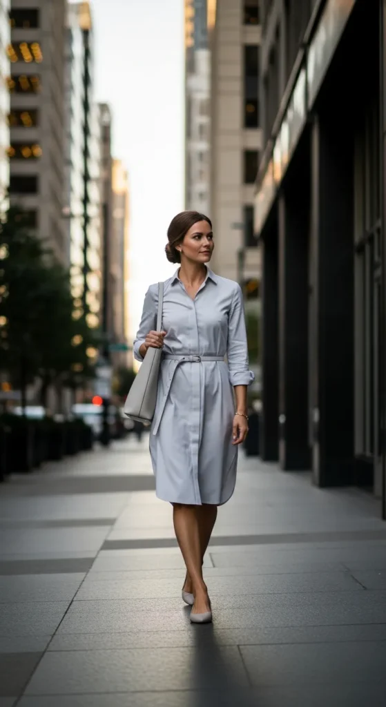 A crisp shirt dress cinched with a waist belt creates a tailored yet flirty shape. It’s perfect for transitioning from casual outings to slightly dressier settings.