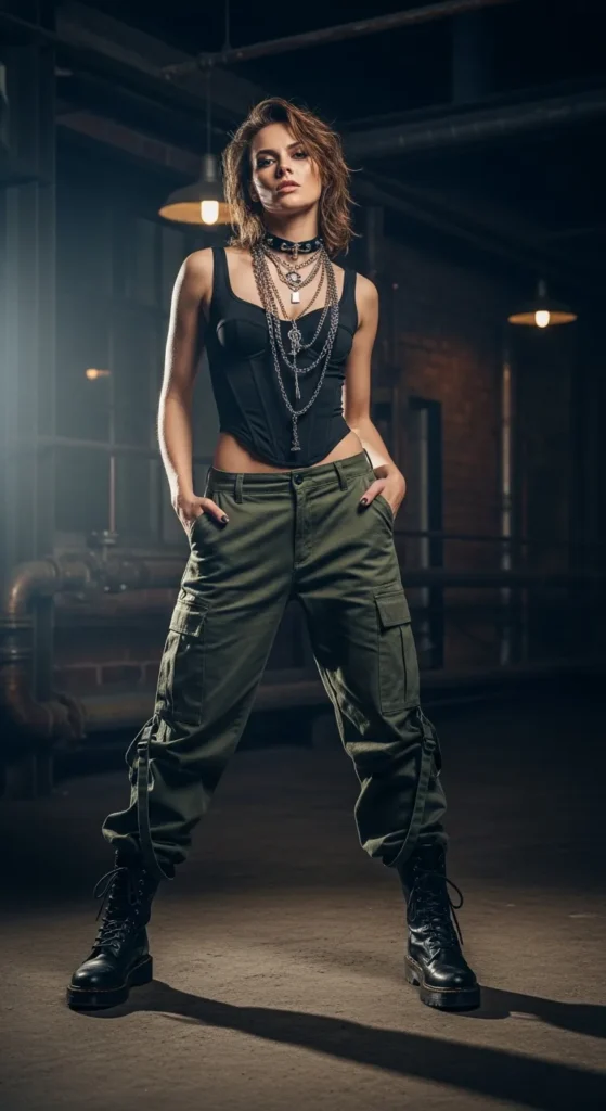 A structured corset top paired with relaxed cargo pants blends edgy and feminine elements. It highlights the waist while keeping the overall vibe cool and effortless.