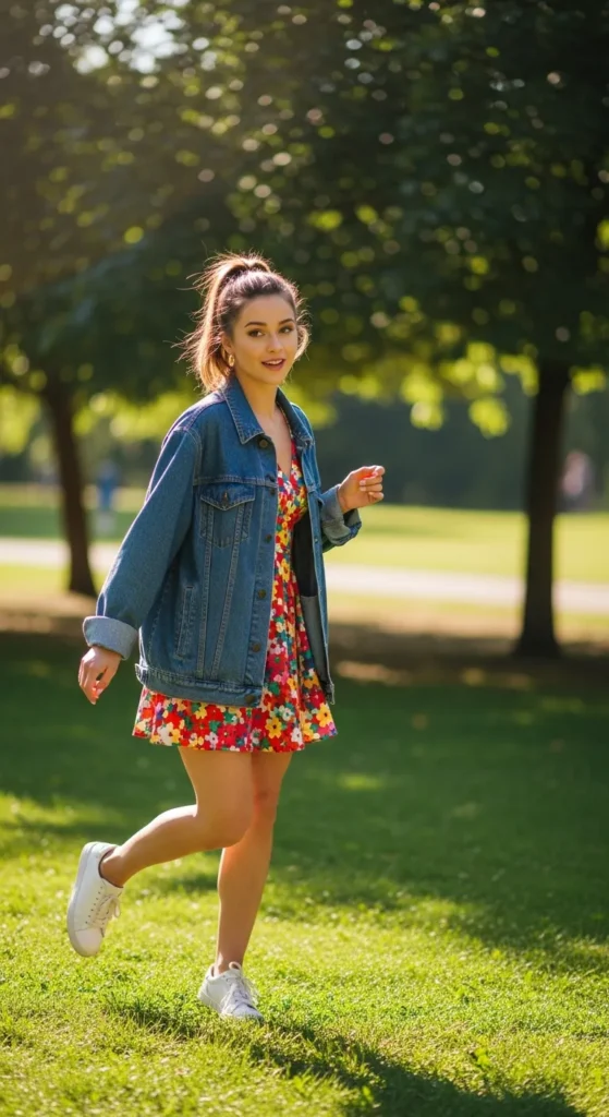 A floral mini dress paired with a slightly oversized denim jacket feels youthful and romantic. The mix of soft prints and structured denim keeps the outfit balanced.